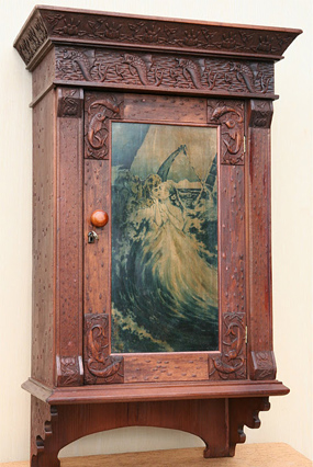 Эта вещь выполнена в стиле модерн, украшена замысловатой резьбой в морской тематике. Дверца шкафчика декорирована резьбой и акварельной вставкой на аллегорический сюжет. Внизу имеется планка для полотенец. Фон выполнен по оригинальной технологии пузырчатой фактуры. При реставрации проклеен корпус шкафчика. Очищена и промыта резьба от лаковых наслоений и пыли. Отреставрирована акварель. После ряда процедур тонирована и покрыта лаком.
