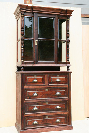 Вполне вместительный шкаф. Верхняя часть шкафа со стеклянными дверцами в переплетах. Сквозь стекла видны полочки для чайной, стеклянной посуды. При желании можно разместить коллекцию фарфоровых игрушек. Нижняя часть комода с выдвигающимися ящиками для домашней утвари. При реставрации был сохранен стиль, оригинальный цвет. Восстановлены утерянные элементы фурнитуры, изготовлены недостающие стекла для переплетов.